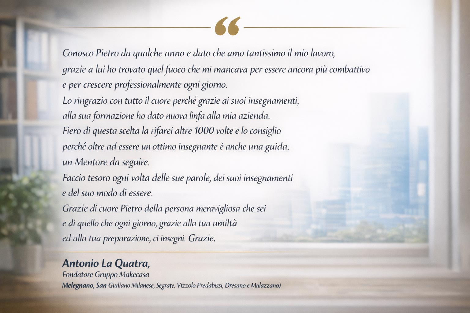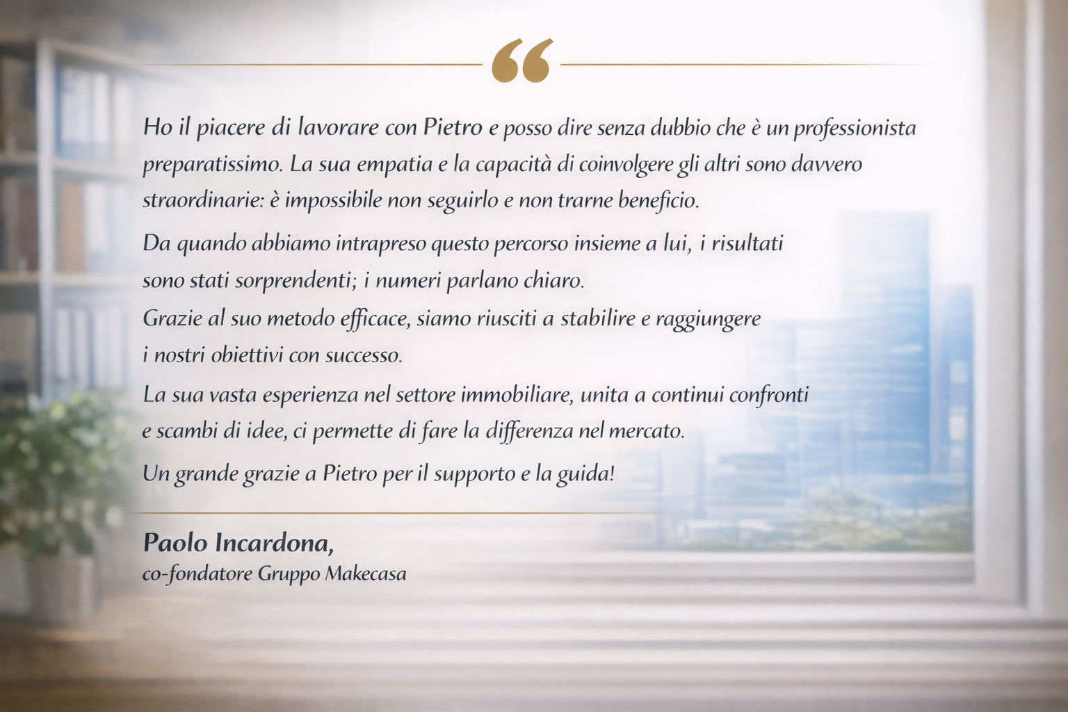 In questi anni ho conosciuto tanti formatori, ma Pietro Margiotta è l'eccellenza, grazie al suo carisma ed alla sua straordinaria esperienza trentennale acquisita direttamente sul campo. Il coach per chi con Metodo, Disciplina e Calendarizzazione vuole migliorare se stesso, per chi desidera creare un ambiente positivo in ufficio e per chi esige incrementare i propri fatturati. Il punto di forza di Pietro è che oltre ad insegnarti le strategie attuali, moderne, per vendere casa, ti trasferisce strumenti pratici che facilitano la professione e ti permettono di raggiungere gli obiettivi prefissati. Grazie Coach per tutto quello che mi hai insegnato.